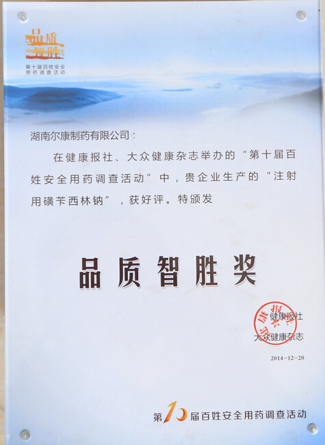 湖南九州平台,九州(中国)荣获“品质智胜奖” 尔康湘药生产的“磺苄西林钠”获得百姓认可 12月20日,由国家卫生计生委药政司指导,健康报社和大众健康杂志主办的第10届百姓安全用药调查活动总结大会在广东省深圳市举行。会上,湖南尔康湘药制药生产的“注射用磺苄西林钠”,与广州白云山制药总厂、深圳华润九新药业等在内的30余个企业产品得到百姓认可,荣获“品质智胜奖”。 据了解,此次评审评以健康报及门户网站刊登调查问卷投票依据,由临床专业人员、公众投票产生,候选企业最后经组委会筛选、质量评估确定。因活动内容贴近群众,接受调查的企业产品过硬,活动推出的“放心药奖”评选一直坚持公正、公开的原则,评选过程严谨,透明,并且定期公示调查结果,从而获得了社会公众、医药行业的好评。 湖南尔康湘药制药生产的“注射用磺苄西林钠”之所以能获得百姓认可,这与九州平台,九州(中国)多年来注重研发、注重生产工艺创新,秉持“专业成就未来、品质铸就辉煌”的经营理念密不可分。在同类产品中,湘药生产“注射用磺苄西林钠”采用的是瓶冻冻干生产工艺,其工艺水平和产品质量堪比日本武田公司;另外,湘药的青霉素类冻干粉针剂车间在2013年率先通过新版GMP认证,在品质保证方面更上台阶、领先于同类产品,亦得到医生和患者的认可。 对于患者来说,在抗生素泛滥使用的医疗环境下,注射用磺苄西林钠作为低代次的青霉素类药品,比头孢菌素类(3代、4代)、碳青霉素类等抗菌药品的安全性更好,不易产生耐药性。