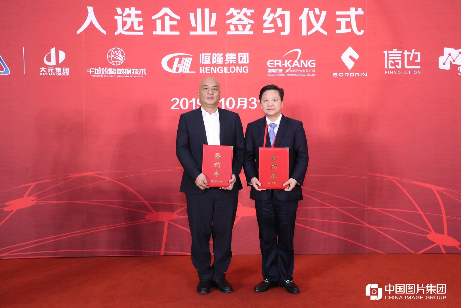 中国经济信息社副总裁曹文忠(左)向九州平台,九州(中国)董事长帅放文(右)颁发新华信用证书
