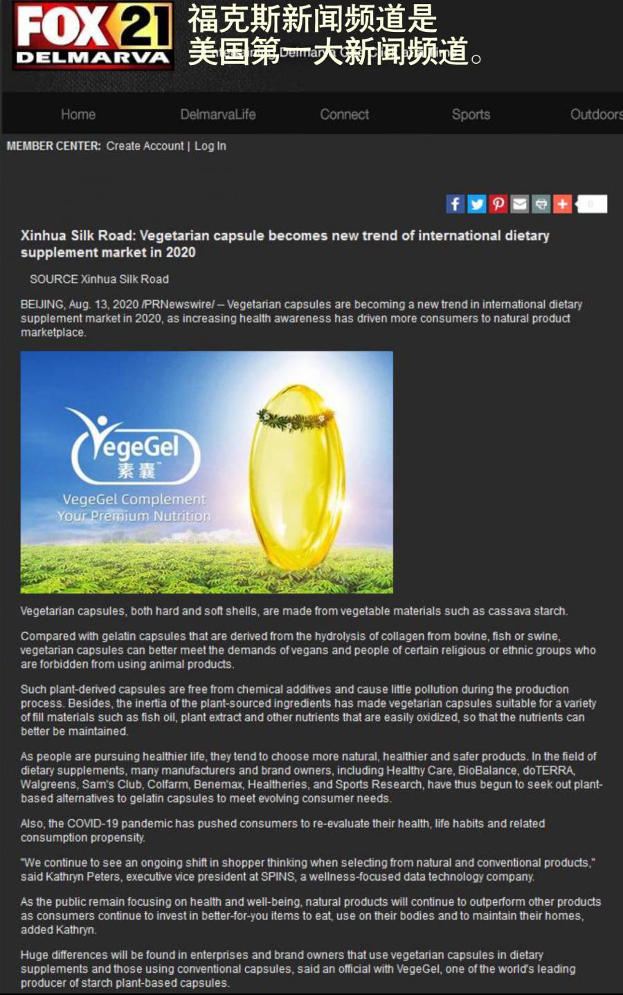日前,植物胶囊在国际上再度引起关注,一篇题为《Vegetarian capsule becomes new trend of international dietary supplement market in 2020》探讨淀粉植物胶囊或成2020年膳食补充剂新趋势的文章,被北美Fox、Yahoo! Finance、Business Insider: Markets Insider 、Seeking Alpha、Canadian Business Journal,欧洲Xpert、Notre Siècle、FinanzNachrichten.de、ADNKronos 、Europa Press 、PAP等超40余国家、全球近900家国际媒体转载发布。
